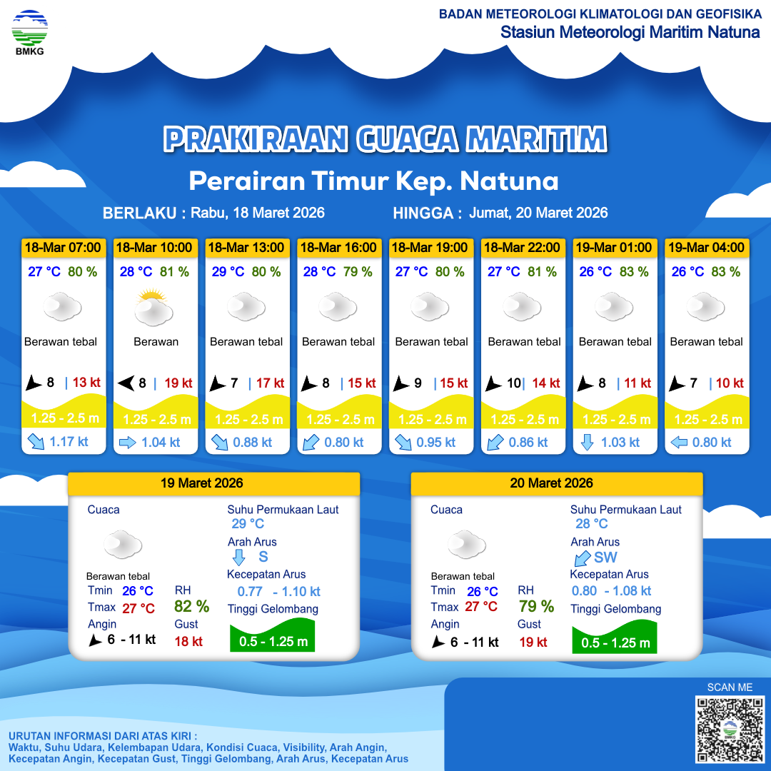 18 Mar 26, 13.00 10 jam kedepan | Timur Laut 9 kt Gust Peningkatan kecepatan angin yang singkat dan tiba-tiba : 15 kt | 1.3 m Sedang | Barat 0.9 Knots | 27 °C | 80 % | |
