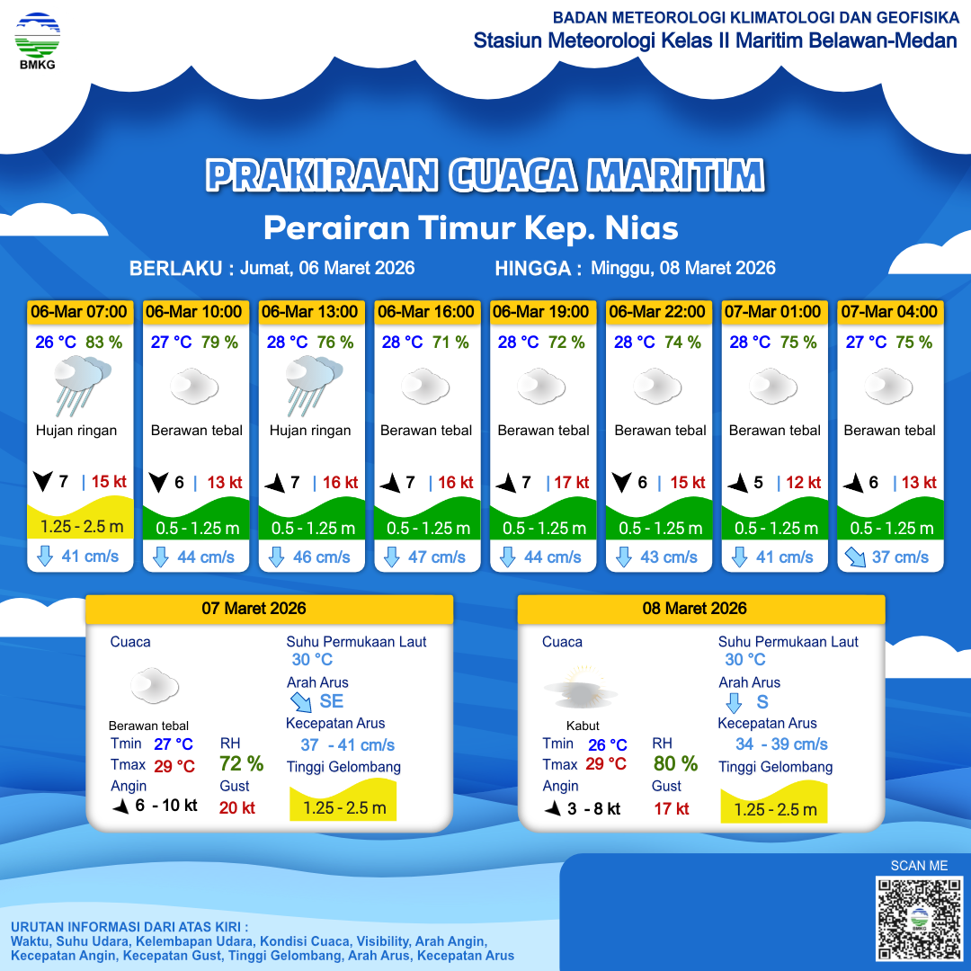6 Mar 26, 11.00 4 jam kedepan | Barat Laut 7 kt Gust Peningkatan kecepatan angin yang singkat dan tiba-tiba : 17 kt | 1.1 m Rendah | Selatan 46.0 cm/s | 28 °C | 71 % | |