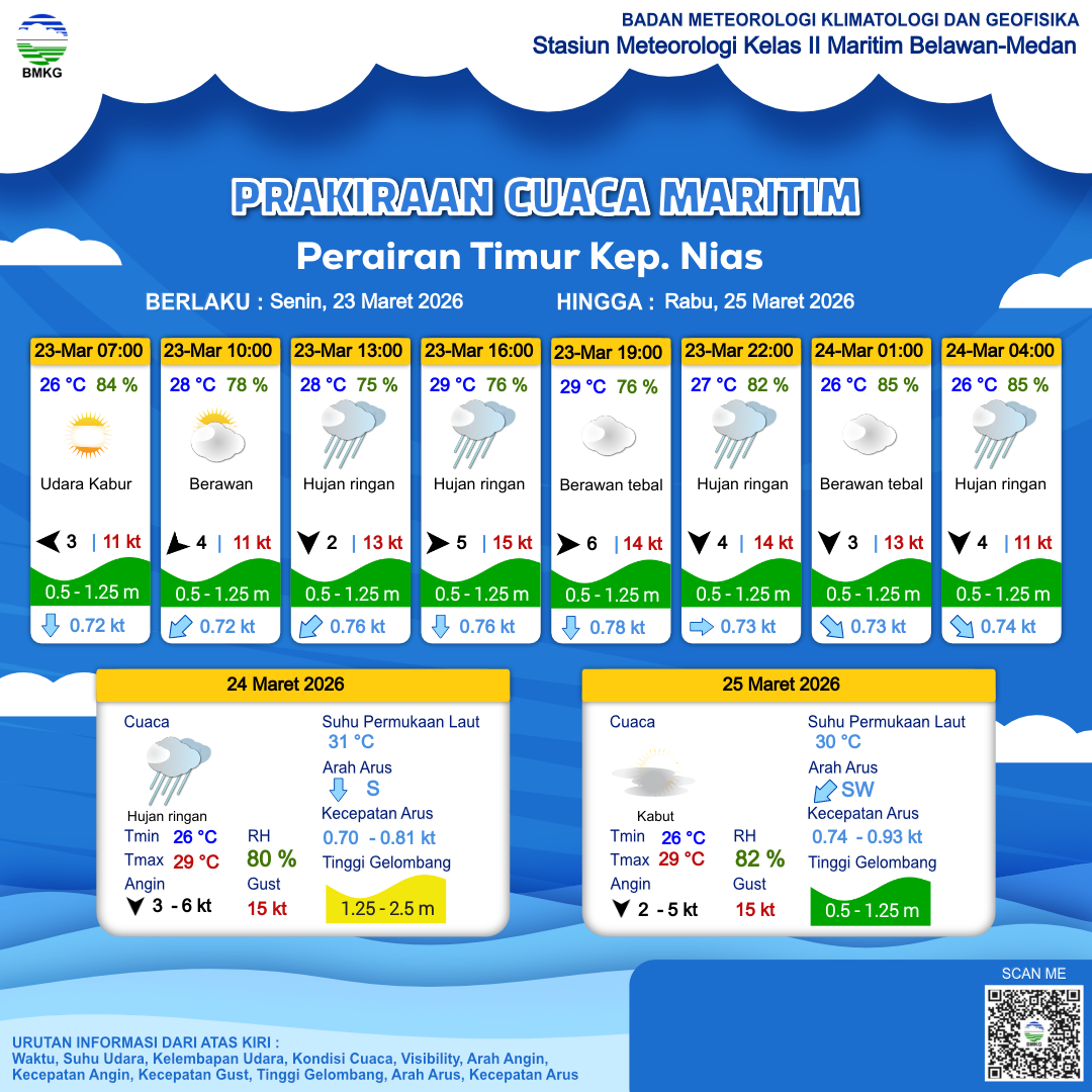 23 Mar 26, 16.00 5 jam kedepan | Utara 4 kt Gust Peningkatan kecepatan angin yang singkat dan tiba-tiba : 14 kt | 1 m Rendah | Timur 0.7 Knots | 27 °C | 83 % | |