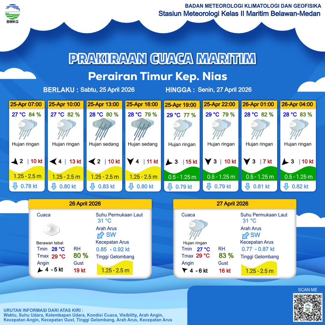 24 Apr 26, 14.00 3 jam kedepan | Timur 6 kt Gust Peningkatan kecepatan angin yang singkat dan tiba-tiba : 9 kt | 1.6 m Sedang | Barat Daya 0.7 Knots | 27 °C | 83 % | |