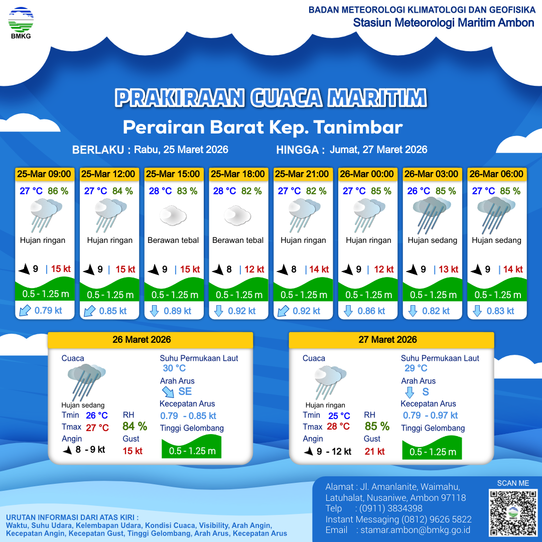 25 Mar 26, 13.00 6 jam kedepan | Barat Laut 4 kt Gust Peningkatan kecepatan angin yang singkat dan tiba-tiba : 12 kt | 1.1 m Rendah | Barat Daya 0.9 Knots | 27 °C | 81 % | |