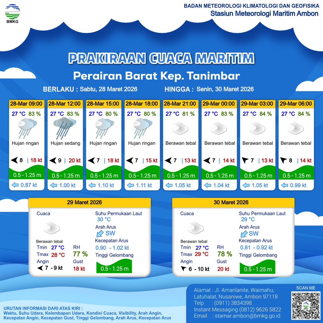28 Mar 26, 19.00 2 jam kedepan | Timur 7 kt Gust Peningkatan kecepatan angin yang singkat dan tiba-tiba : 14 kt | 1 m Rendah | Barat Daya 1.2 Knots | 27 °C | 83 % | |