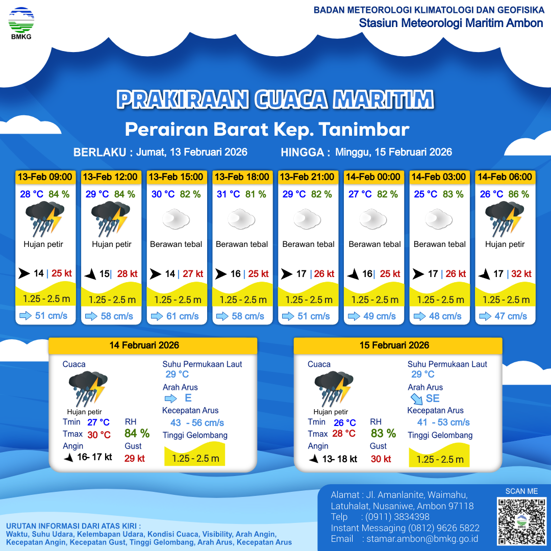 13 Feb 26, 19.00 2 jam kedepan | Barat Laut 14 kt Gust Peningkatan kecepatan angin yang singkat dan tiba-tiba : 28 kt | 1.8 m Sedang | Timur 58.0 cm/s | 26 °C | 85 % | |