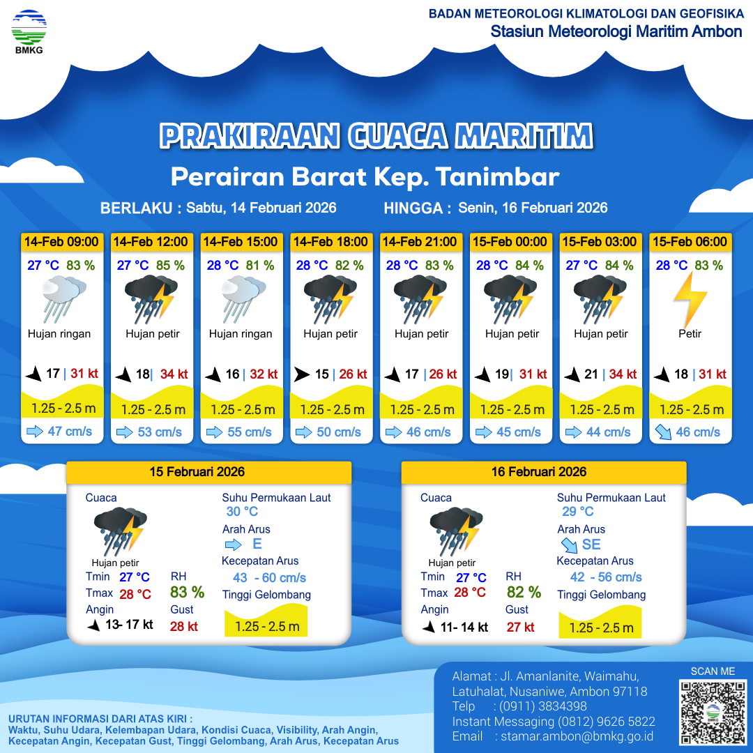 14 Feb 26, 11.00 2 jam kedepan | Barat Laut 14 kt Gust Peningkatan kecepatan angin yang singkat dan tiba-tiba : 29 kt | 1.9 m Sedang | Timur 54.0 cm/s | 27 °C | 86 % | |