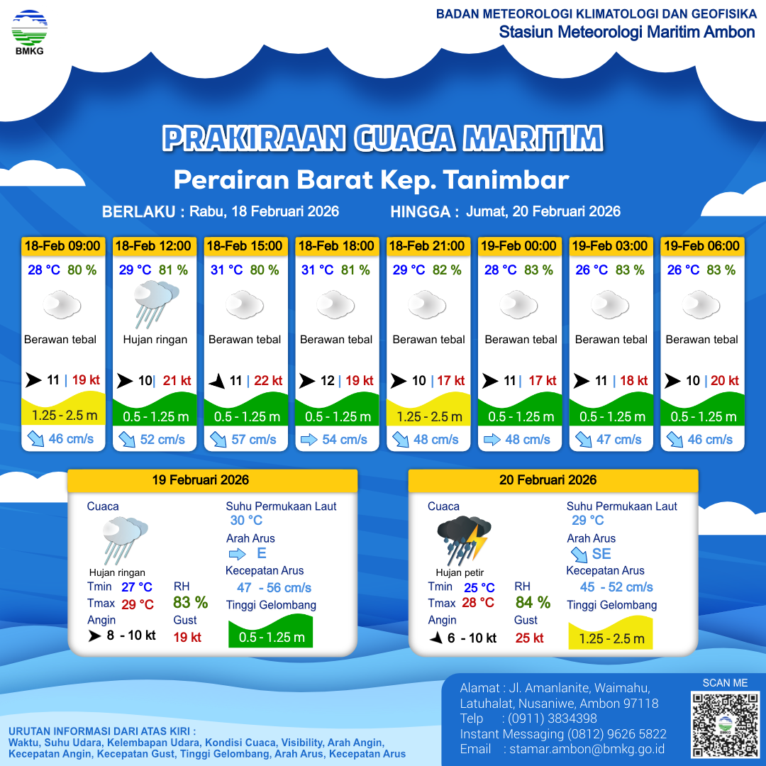 18 Feb 26, 13.00 3 jam kedepan | Barat 10 kt Gust Peningkatan kecepatan angin yang singkat dan tiba-tiba : 17 kt | 1.2 m Rendah | Timur 56.0 cm/s | 28 °C | 83 % | |
