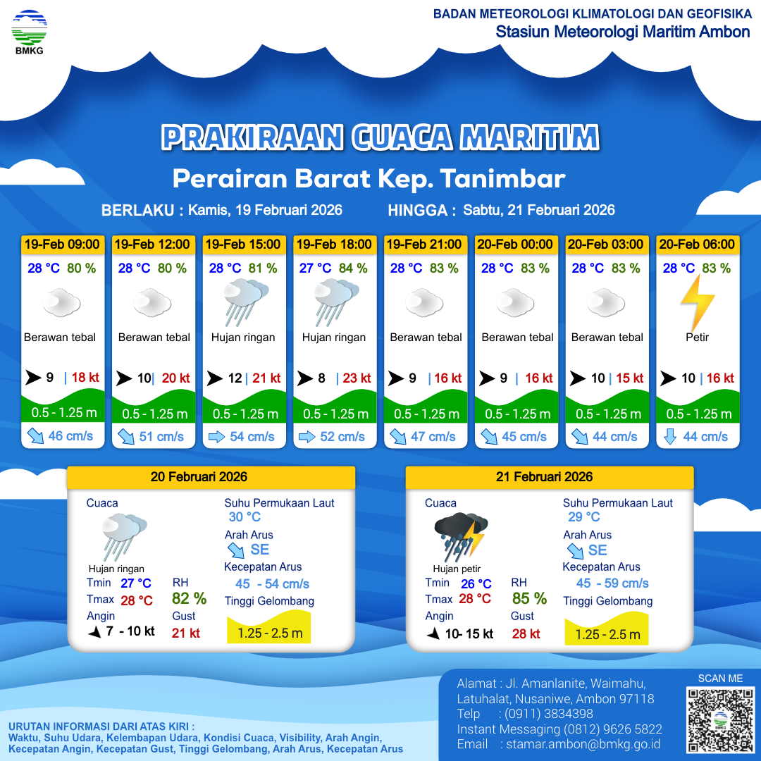19 Feb 26, 12.00 2 jam kedepan | Barat 9 kt Gust Peningkatan kecepatan angin yang singkat dan tiba-tiba : 17 kt | 1.1 m Rendah | Timur 54.0 cm/s | 28 °C | 85 % | |
