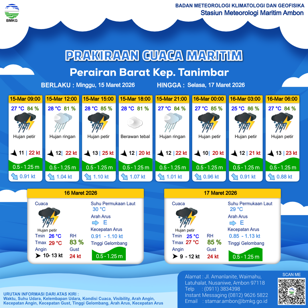 15 Mar 26, 11.00 2 jam kedepan | Barat Laut 9 kt Gust Peningkatan kecepatan angin yang singkat dan tiba-tiba : 19 kt | 1.1 m Rendah | Timur 1.0 knot | 28 °C | 81 % | |