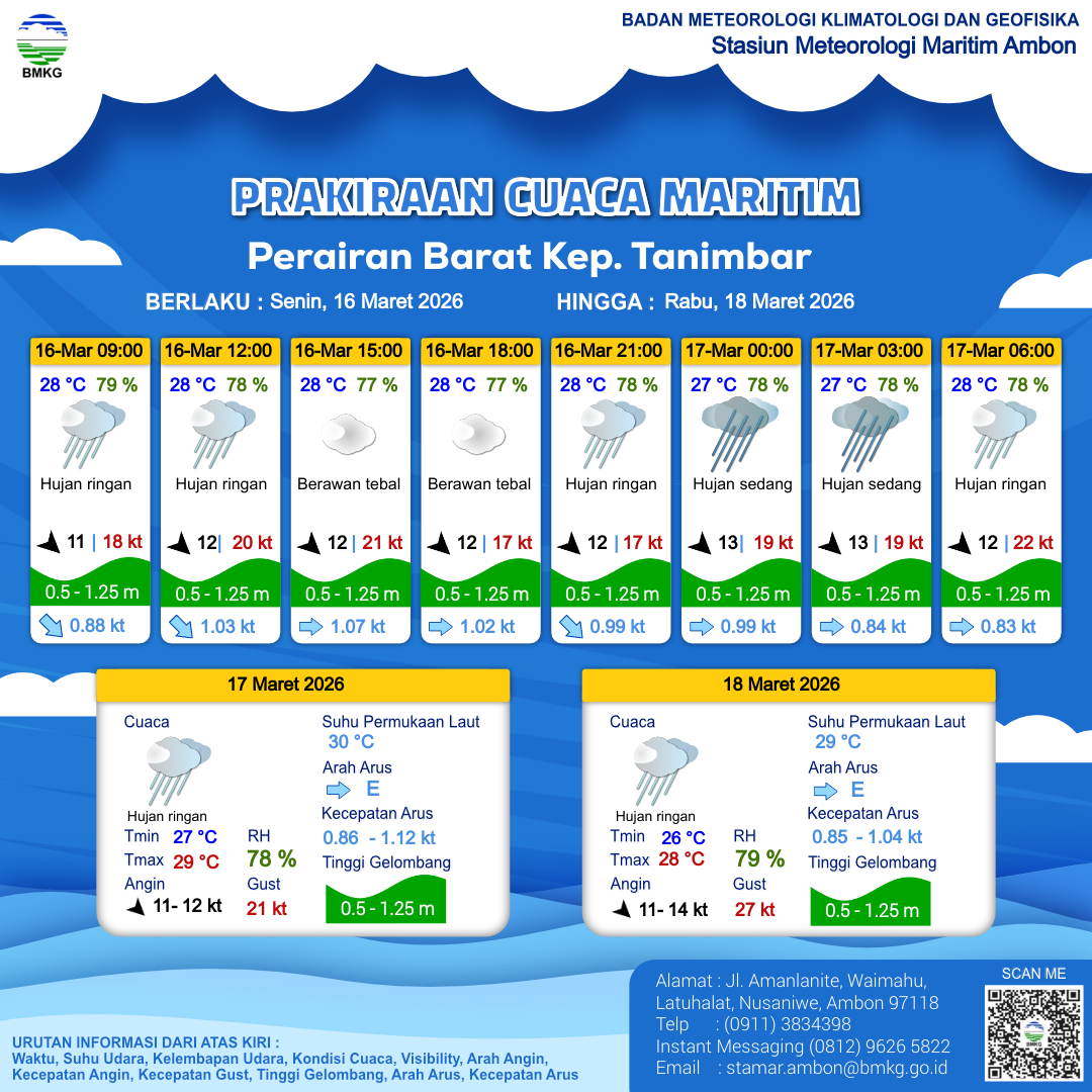 16 Mar 26, 13.00 4 jam kedepan | Barat Laut 10 kt Gust Peningkatan kecepatan angin yang singkat dan tiba-tiba : 17 kt | 1.1 m Rendah | Timur 1.0 knot | 28 °C | 78 % | |