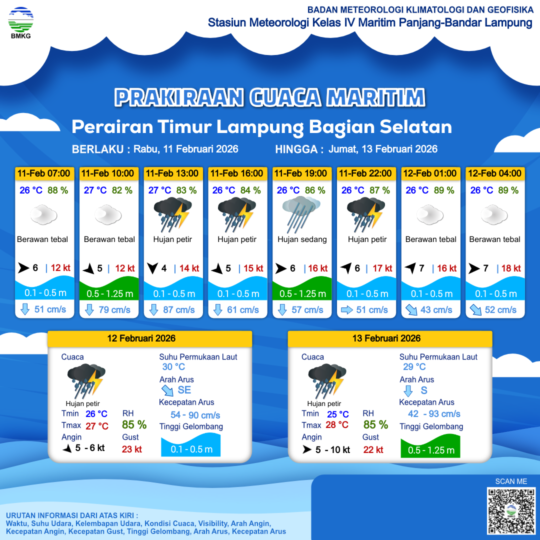 11 Feb 26, 12.00 4 jam kedepan | Barat 6 kt Gust Peningkatan kecepatan angin yang singkat dan tiba-tiba : 16 kt | 0.6 m Rendah | Timur 57.0 cm/s | 26 °C | 86 % | |
