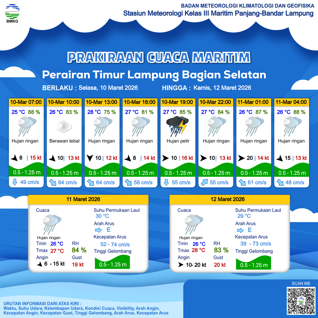 10 Mar 26, 12.00 12 jam kedepan | Barat 10 kt Gust Peningkatan kecepatan angin yang singkat dan tiba-tiba : 16 kt | 0.7 m Rendah | Timur 55.0 cm/s | 27 °C | 85 % | |