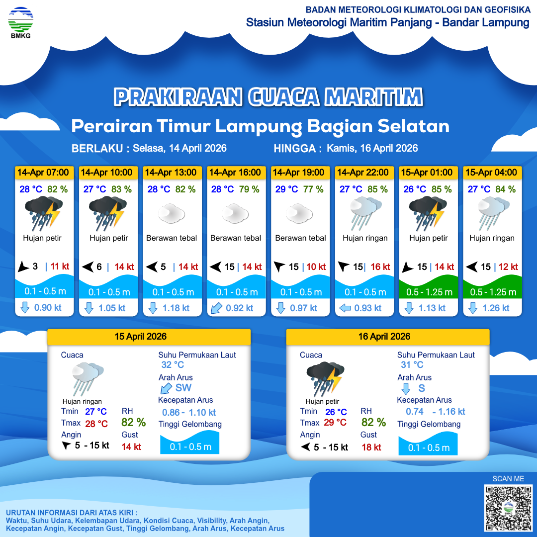 14 Apr 26, 20.00 3 jam kedepan | Timur 15 kt Gust Peningkatan kecepatan angin yang singkat dan tiba-tiba : 12 kt | 0.8 m Rendah | Selatan 1.3 Knots | 27 °C | 85 % | |