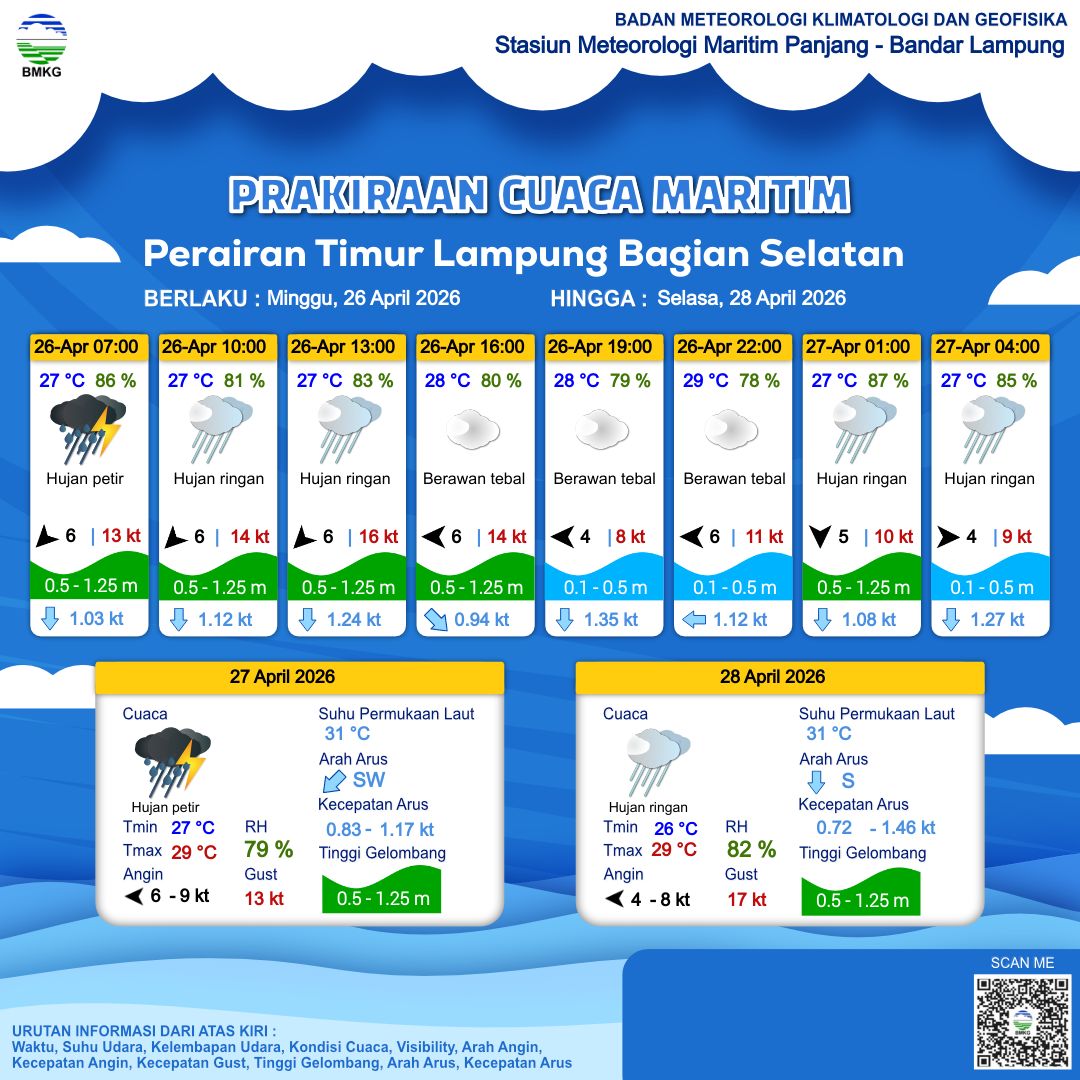 25 Apr 26, 20.00 2 jam kedepan | Hujan Ringan | Timur Laut 8 kt Gust Peningkatan kecepatan angin yang singkat dan tiba-tiba : 13 kt | | | 27 °C | 86 % |