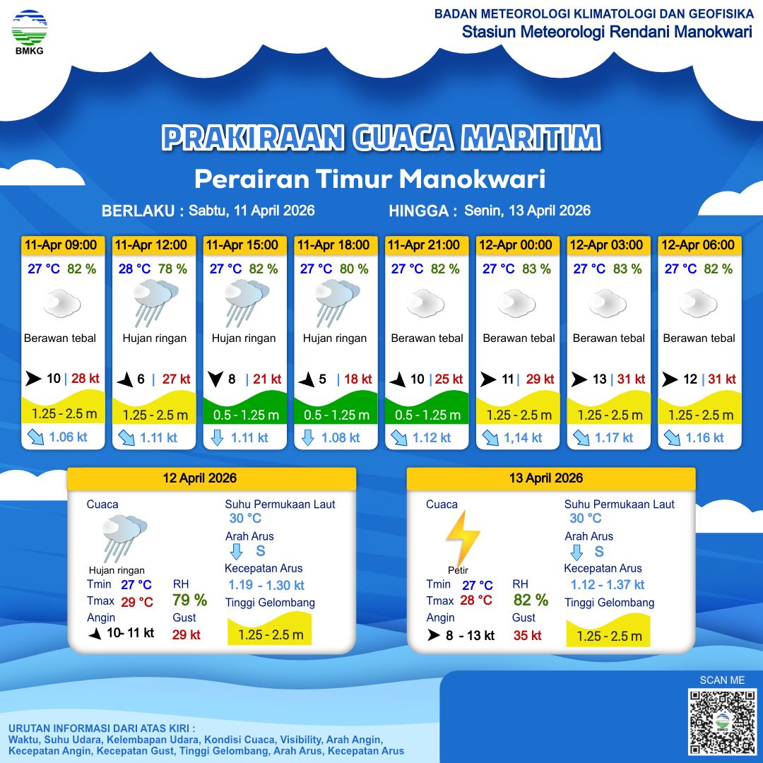 11 Apr 26, 19.00 3 jam kedepan | Barat 13 kt Gust Peningkatan kecepatan angin yang singkat dan tiba-tiba : 32 kt | 1.5 m Sedang | Tenggara 1.2 Knots | 27 °C | 82 % | |