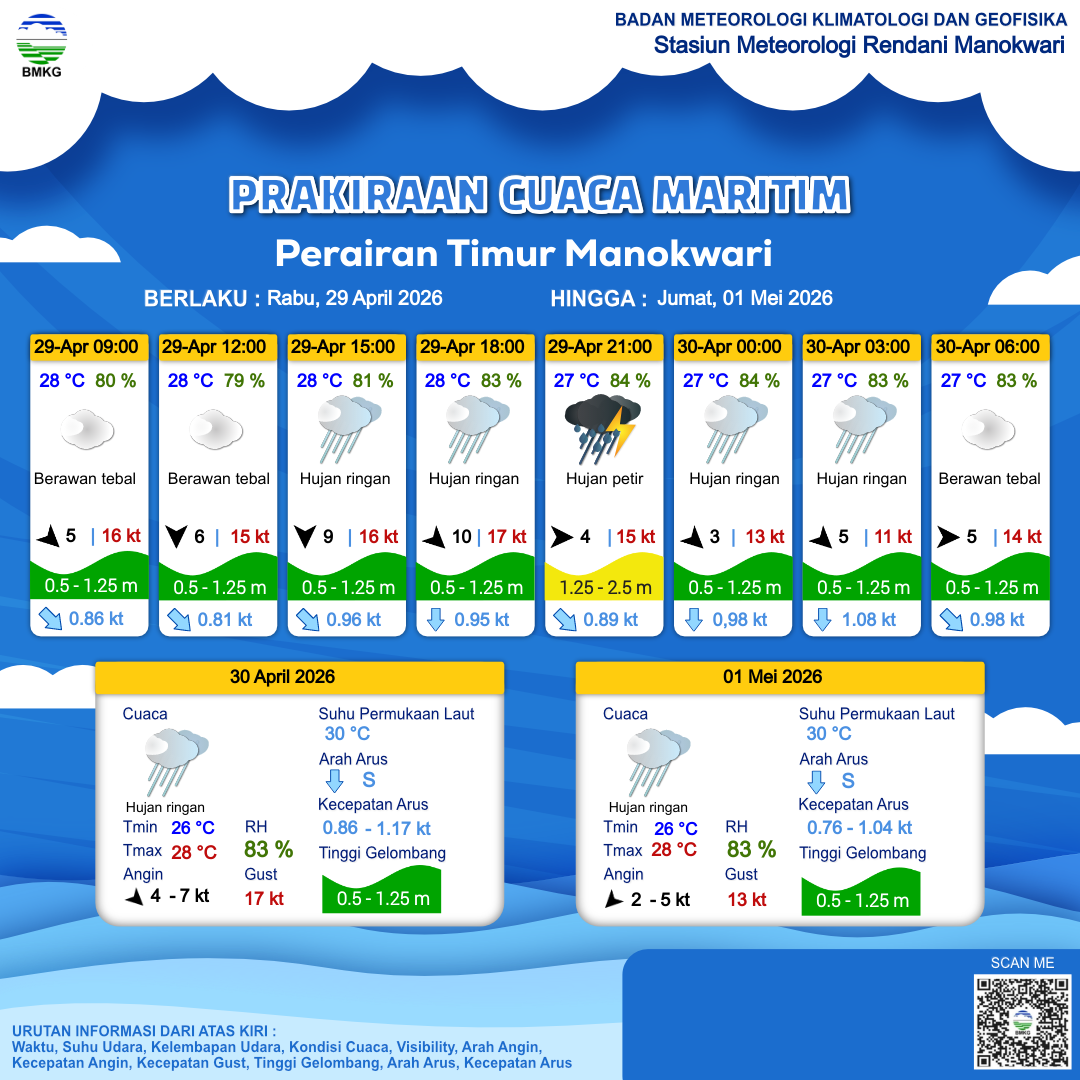 28 Apr 26, 13.00 4 jam kedepan | Barat 5 kt Gust Peningkatan kecepatan angin yang singkat dan tiba-tiba : 15 kt | 1.2 m Rendah | Selatan 0.7 Knots | 28 °C | 80 % | |