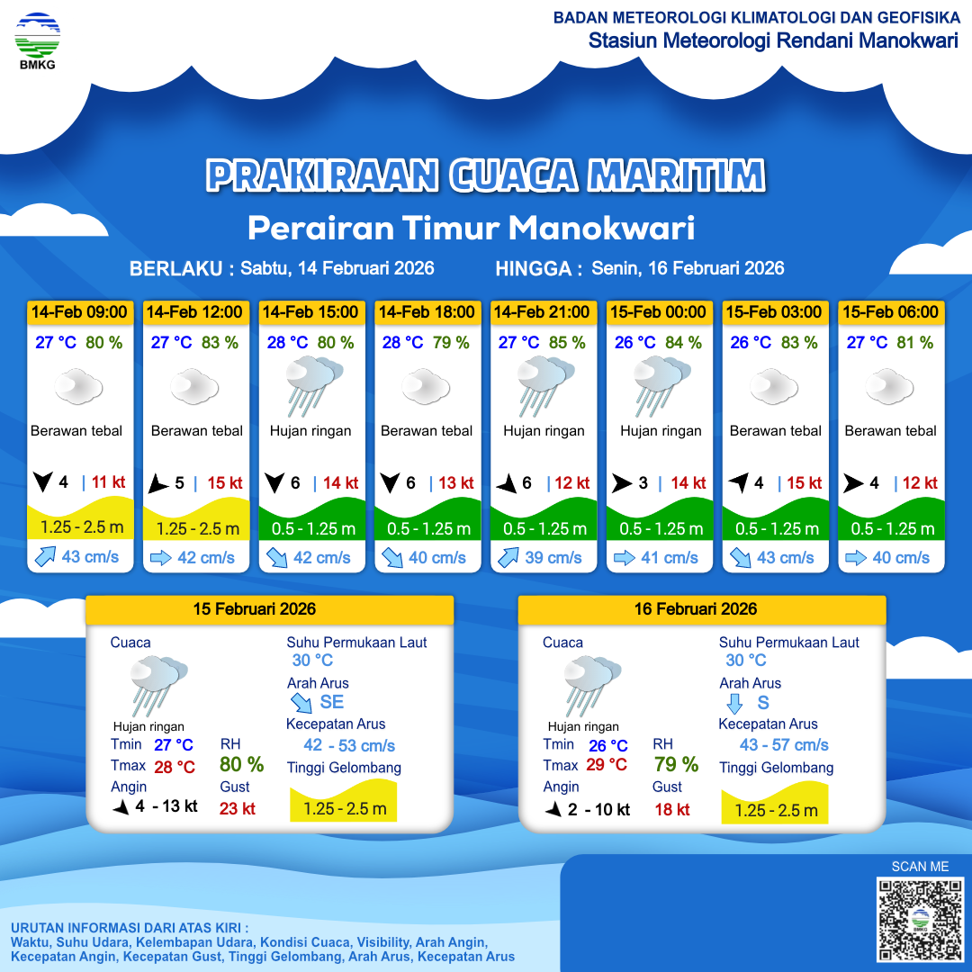 14 Feb 26, 22.00 9 jam kedepan | Barat 4 kt Gust Peningkatan kecepatan angin yang singkat dan tiba-tiba : 11 kt | 1.1 m Rendah | Timur 0.1 cm/s | 27 °C | 81 % | |