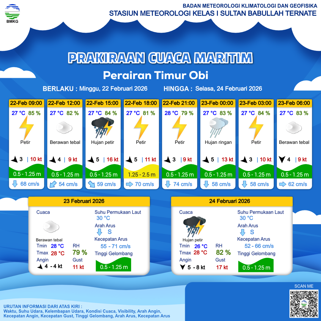 21 Feb 26, 22.00 2 jam kedepan | Hujan Ringan | Barat Laut 6 kt Gust Peningkatan kecepatan angin yang singkat dan tiba-tiba : 13 kt | | | 27 °C | 84 % |