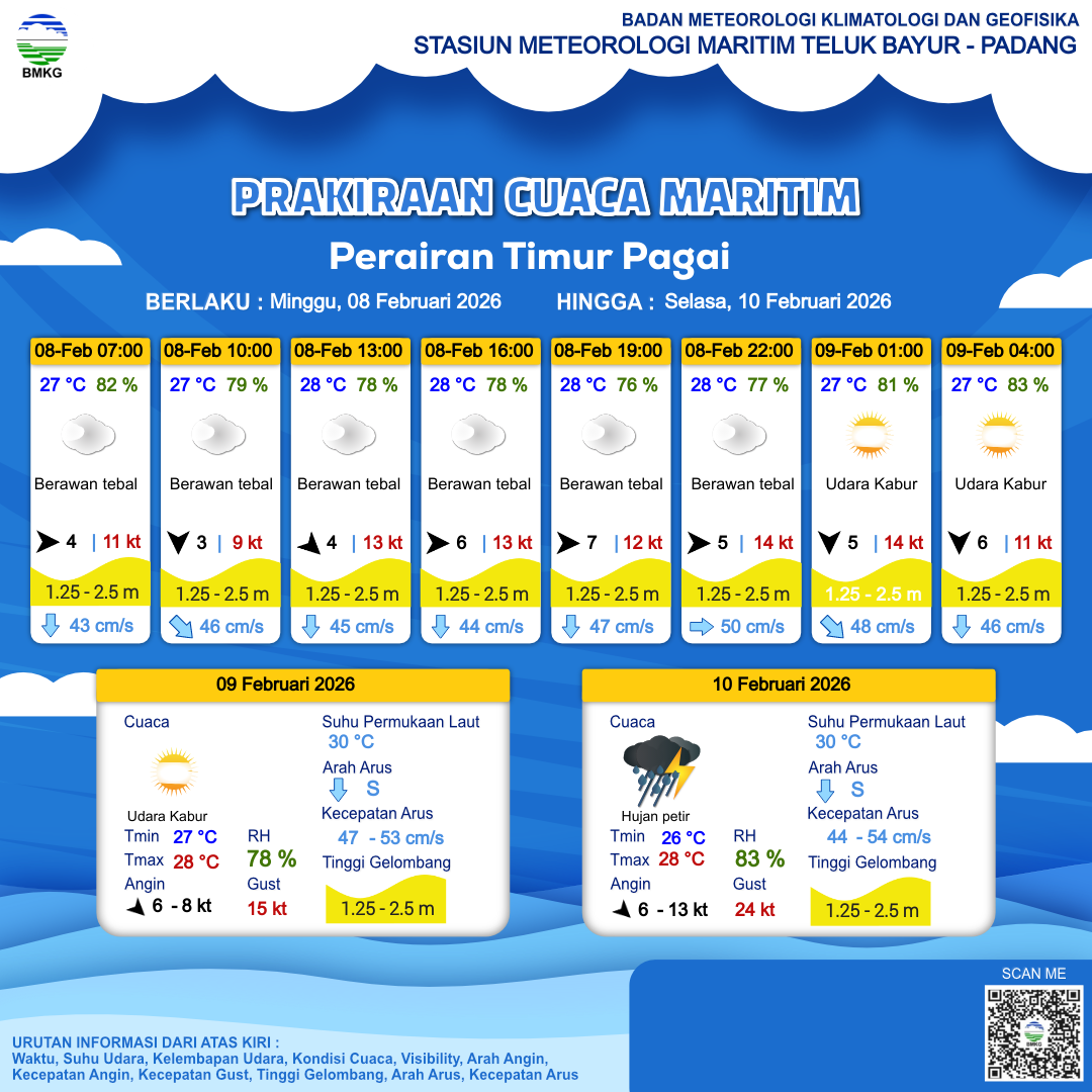 8 Feb 26, 14.00 12 jam kedepan | Barat 5 kt Gust Peningkatan kecepatan angin yang singkat dan tiba-tiba : 14 kt | 1.4 m Sedang | Timur 49.0 cm/s | 28 °C | 77 % | |