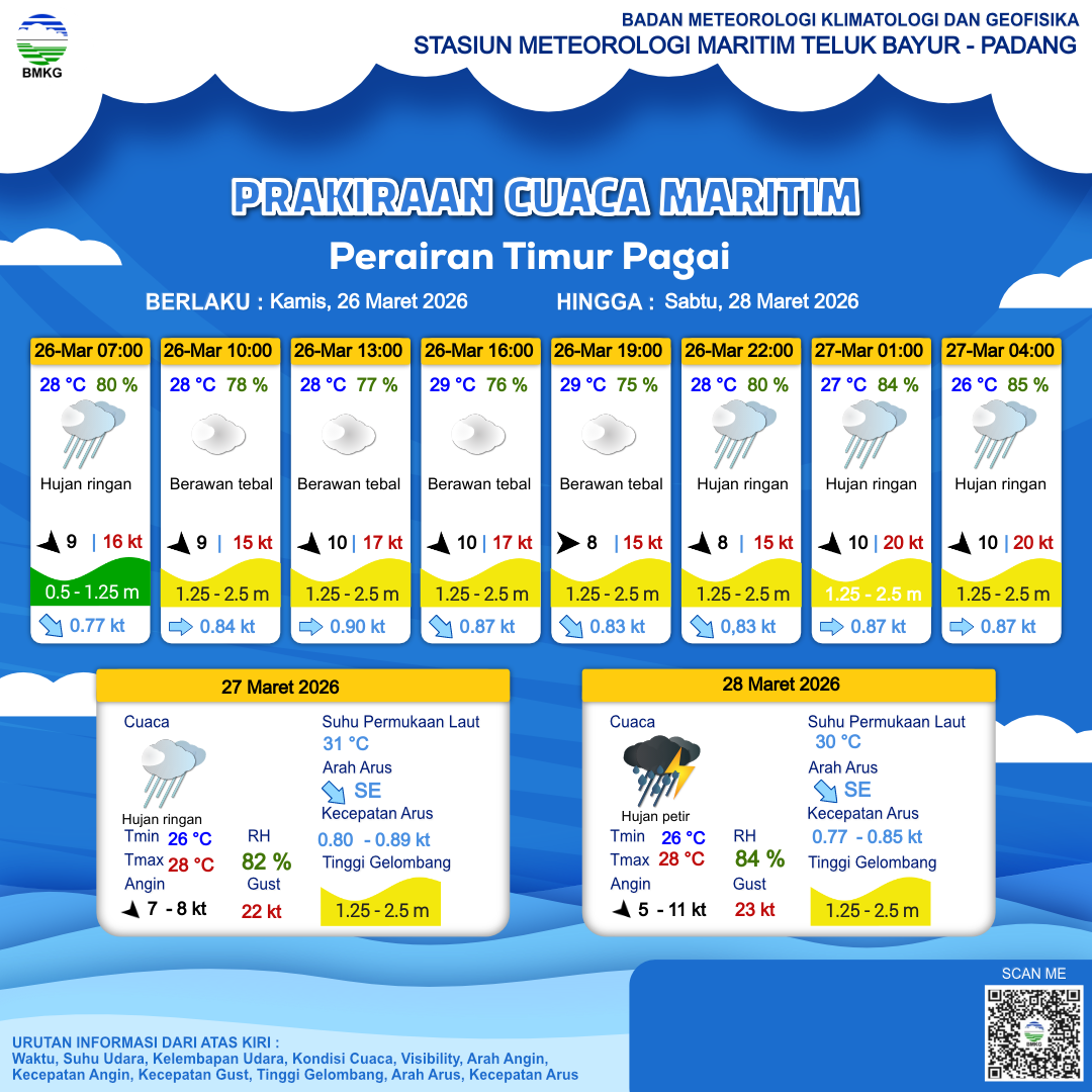 26 Mar 26, 05.00 3 jam kedepan | Barat Laut 10 kt Gust Peningkatan kecepatan angin yang singkat dan tiba-tiba : 16 kt | 1.1 m Rendah | Timur 0.9 Knots | 28 °C | 77 % | |