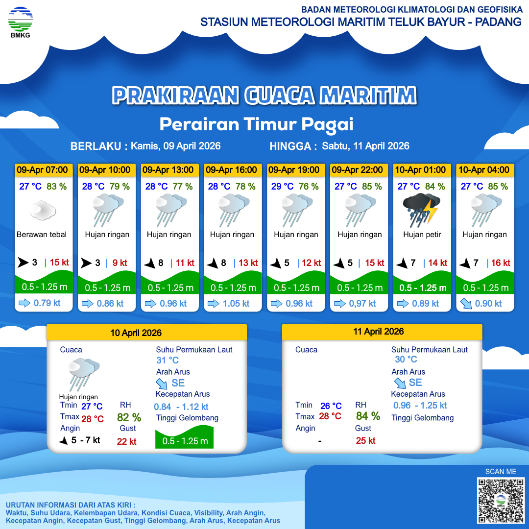 10 Apr 26, 08.00 10 jam kedepan | Barat 11 kt Gust Peningkatan kecepatan angin yang singkat dan tiba-tiba : 22 kt | 0.7 m Rendah | Tenggara 1.0 Knots | 27 °C | 82 % | |