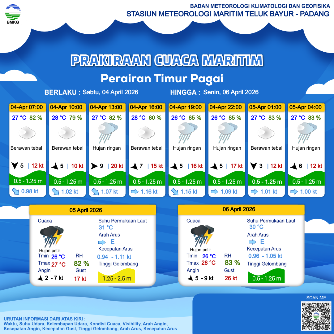 5 Apr 26, 04.00 6 jam kedepan | Barat Laut 4 kt Gust Peningkatan kecepatan angin yang singkat dan tiba-tiba : 13 kt | 1.3 m Sedang | Timur 0.9 Knots | 27 °C | 81 % | |