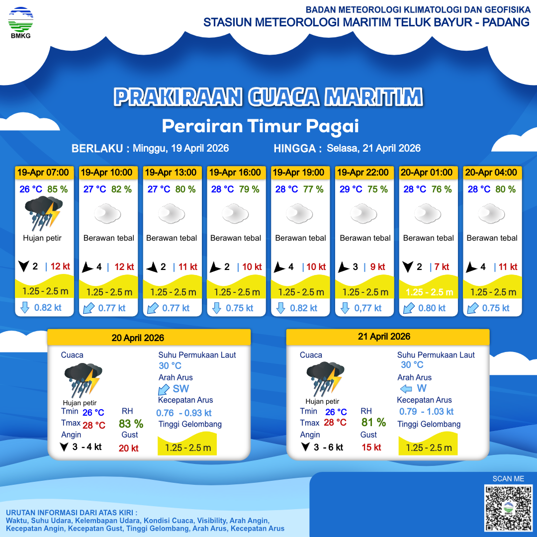 19 Apr 26, 02.00 2 jam kedepan | Timur Laut 4 kt Gust Peningkatan kecepatan angin yang singkat dan tiba-tiba : 10 kt | 1.6 m Sedang | Selatan 0.8 Knots | 27 °C | 83 % | |