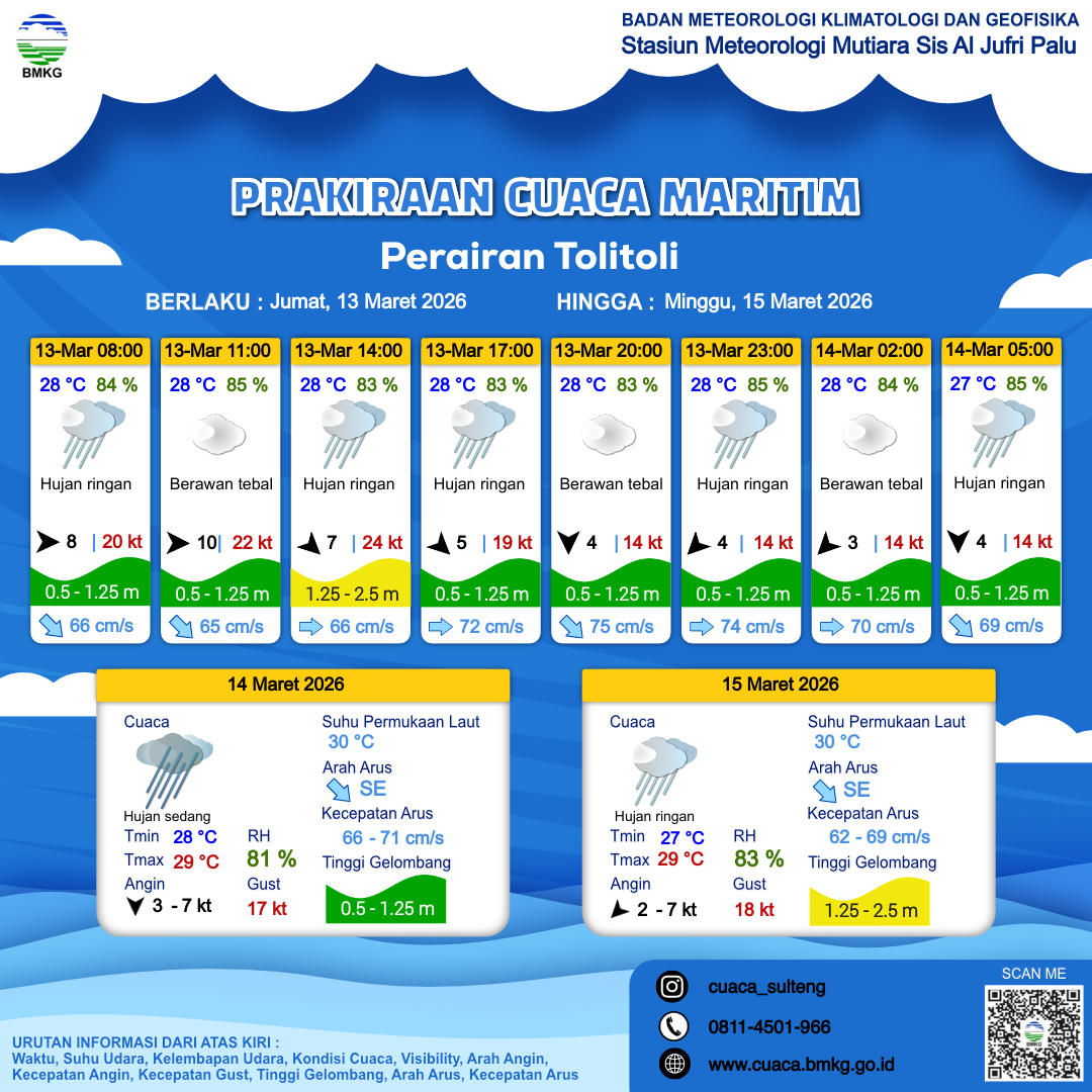 13 Mar 26, 23.00 3 jam kedepan | Hujan Sedang | Barat Laut 4 kt Gust Peningkatan kecepatan angin yang singkat dan tiba-tiba : 14 kt | | | 28 °C | 85 % |