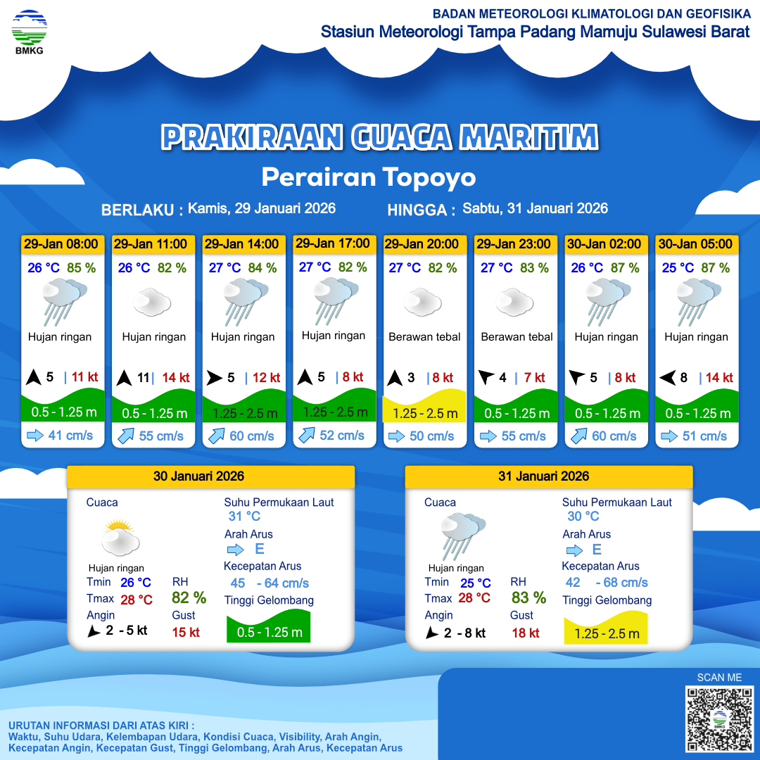 29 Jan 26, 06.00 4 jam kedepan | Barat 4 kt Gust Peningkatan kecepatan angin yang singkat dan tiba-tiba : 12 kt | 1.5 m Sedang | Timur Laut 60.0 cm/s | 27 °C | 84 % | |