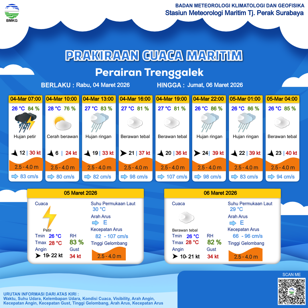 4 Mar 26, 23.00 4 jam kedepan | Petir | Barat 20 kt Gust Peningkatan kecepatan angin yang singkat dan tiba-tiba : 34 kt | | | 26 °C | 83 % |