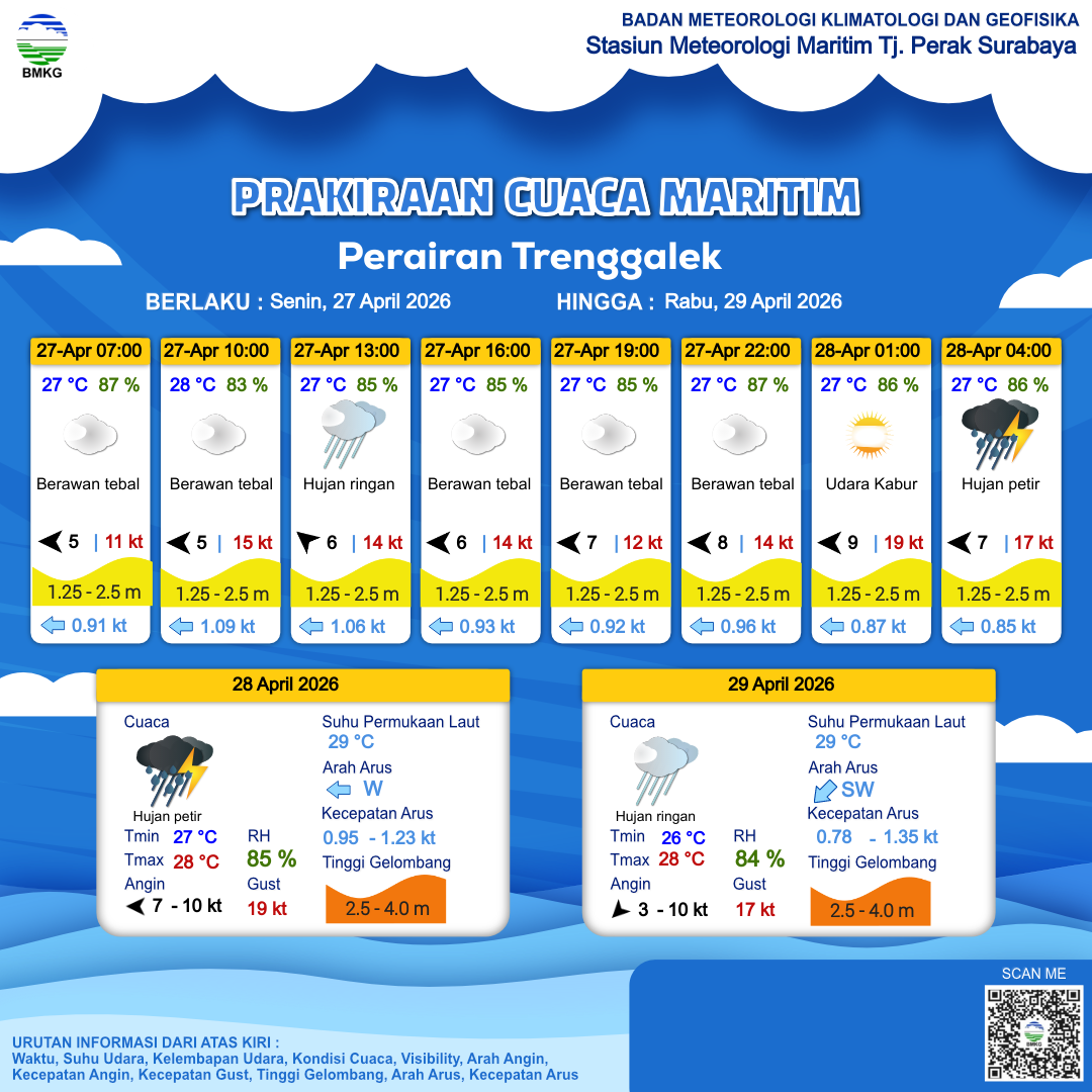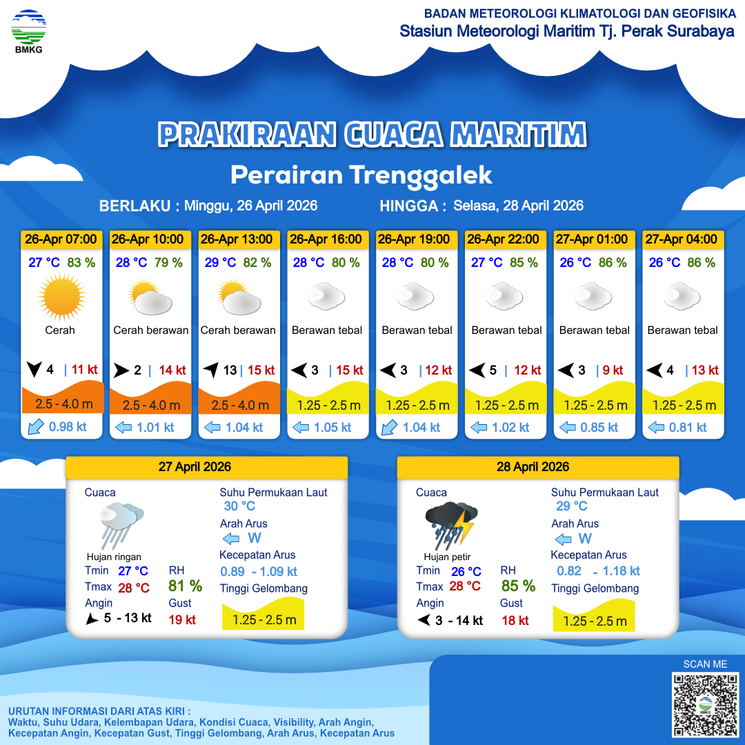 26 Apr 26, 08.00 4 jam kedepan | Timur 3 kt Gust Peningkatan kecepatan angin yang singkat dan tiba-tiba : 14 kt | 2.5 m Tinggi | Barat 1.1 Knots | 28 °C | 81 % | |