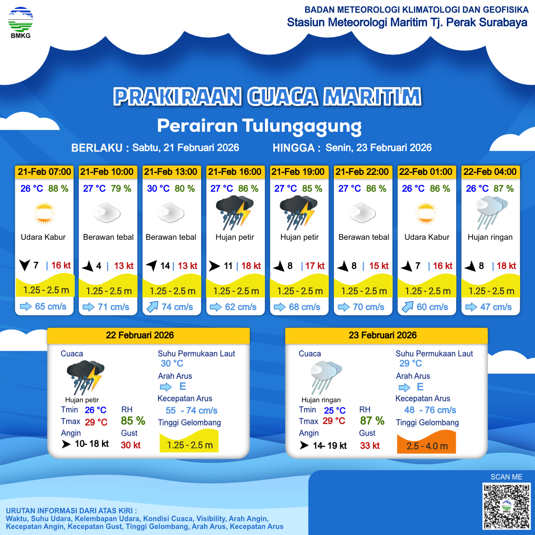 21 Feb 26, 23.00 7 jam kedepan | Barat Laut 10 kt Gust Peningkatan kecepatan angin yang singkat dan tiba-tiba : 20 kt | 1.5 m Sedang | Timur 51.0 cm/s | 25 °C | 89 % |