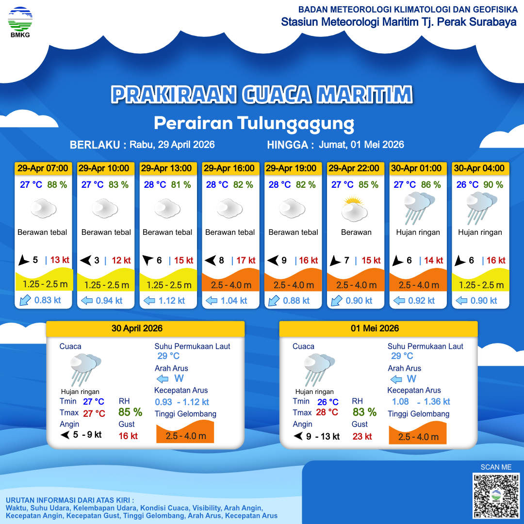 29 Apr 26, 02.00 2 jam kedepan | Timur 3 kt Gust Peningkatan kecepatan angin yang singkat dan tiba-tiba : 12 kt | 2.5 m Tinggi | Barat Daya 0.9 Knots | 27 °C | 85 % | |