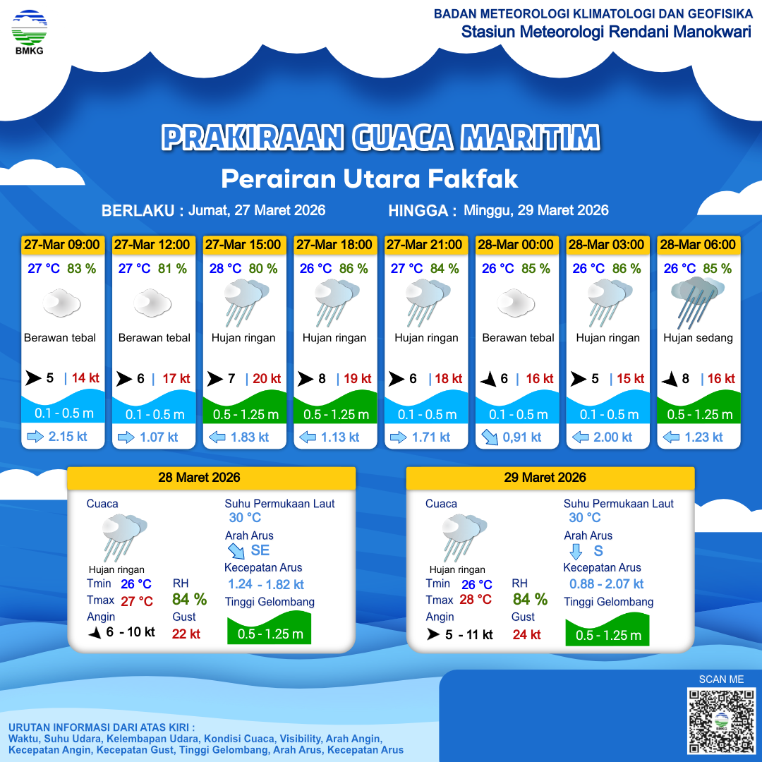 27 Mar 26, 12.00 3 jam kedepan | Barat 6 kt Gust Peningkatan kecepatan angin yang singkat dan tiba-tiba : 18 kt | 0.5 m Rendah | Timur 1.7 Knots | 27 °C | 84 % | |