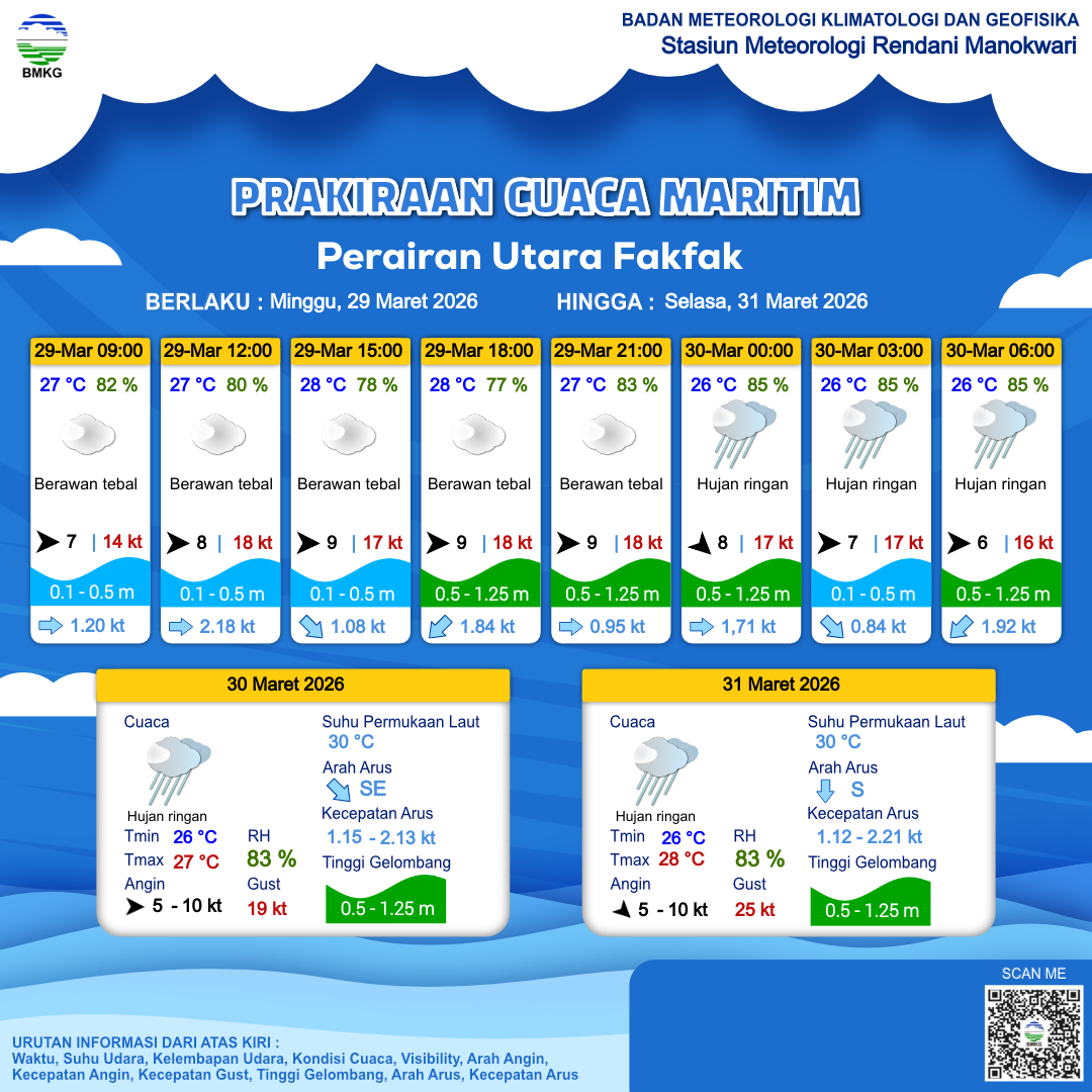 29 Mar 26, 13.00 12 jam kedepan | Barat 9 kt Gust Peningkatan kecepatan angin yang singkat dan tiba-tiba : 19 kt | 0.9 m Rendah | Timur 1.0 Knots | 27 °C | 84 % | |
