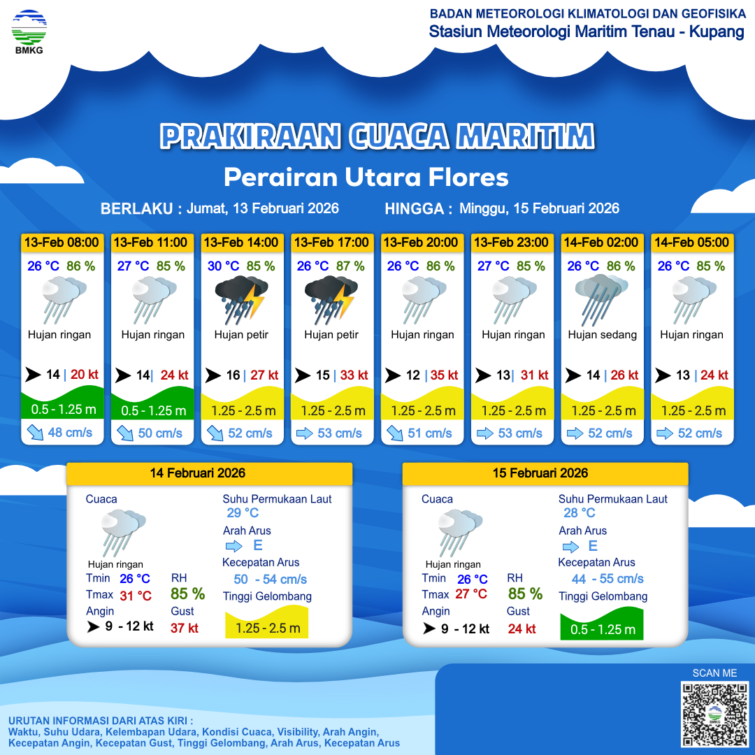 13 Feb 26, 17.00 3 jam kedepan | Barat 14 kt Gust Peningkatan kecepatan angin yang singkat dan tiba-tiba : 31 kt | 1.5 m Sedang | Timur 53.0 cm/s | 27 °C | 86 % | |