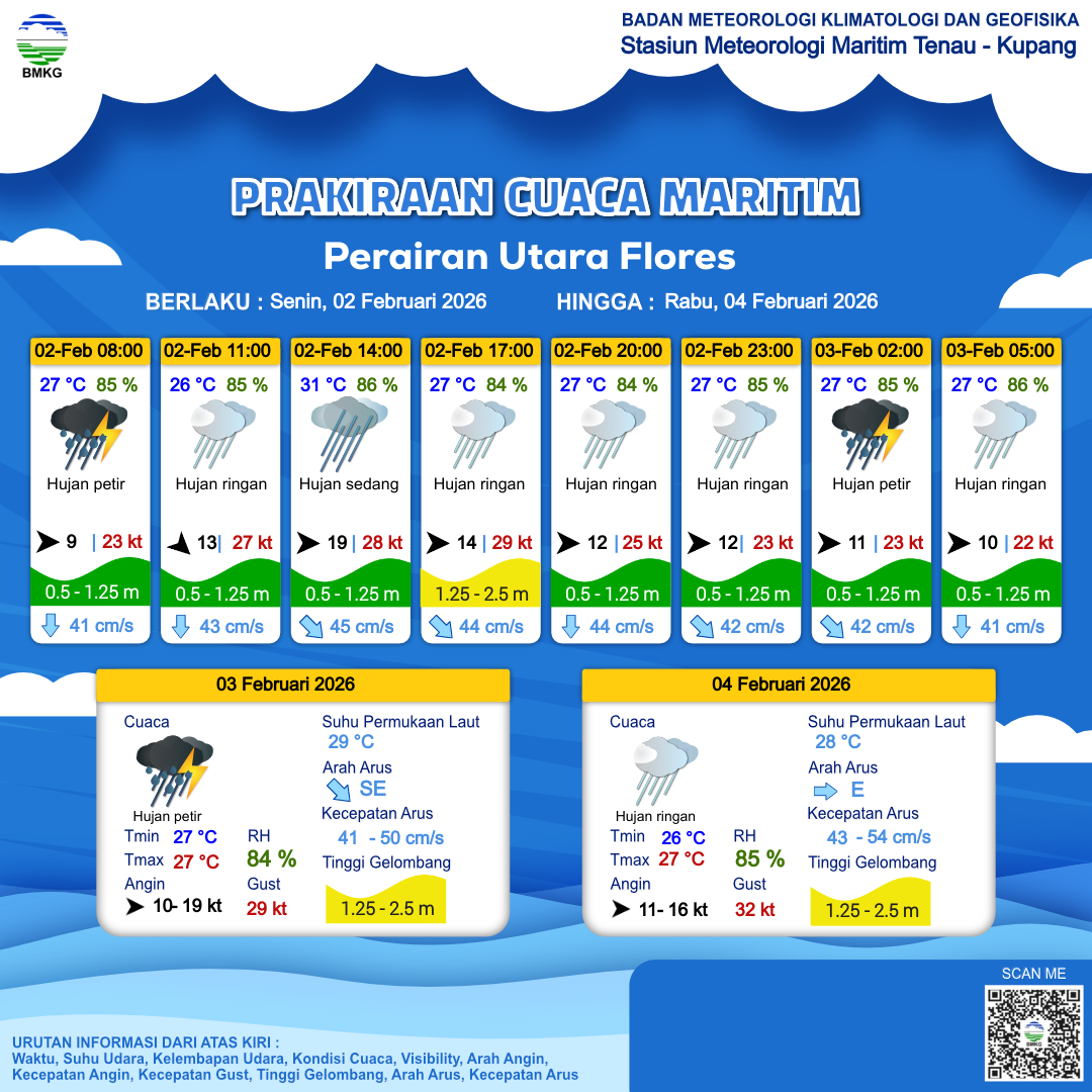 2 Feb 26, 22.00 2 jam kedepan | Hujan Ringan | Barat 10 kt Gust Peningkatan kecepatan angin yang singkat dan tiba-tiba : 23 kt | | | 27 °C | 86 % |