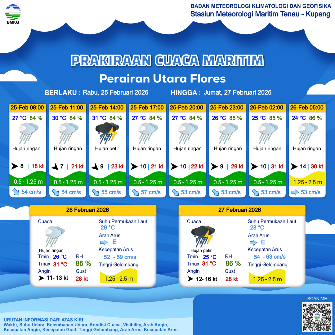 24 Feb 26, 08.00 13 jam yang lalu | Hujan Ringan | Barat 9 kt Gust Peningkatan kecepatan angin yang singkat dan tiba-tiba : 26 kt | | | 28 °C | 84 % |
