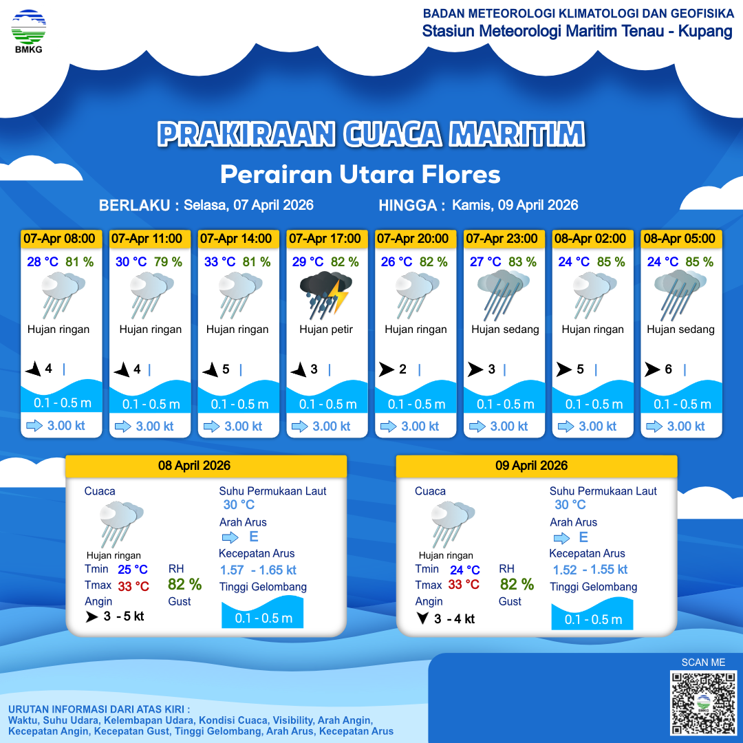 7 Apr 26, 12.00 9 jam kedepan | Barat 2 kt Gust Peningkatan kecepatan angin yang singkat dan tiba-tiba : kt | 0.4 m Tenang | Timur 3.0 Knots | 26 °C | 82 % | |