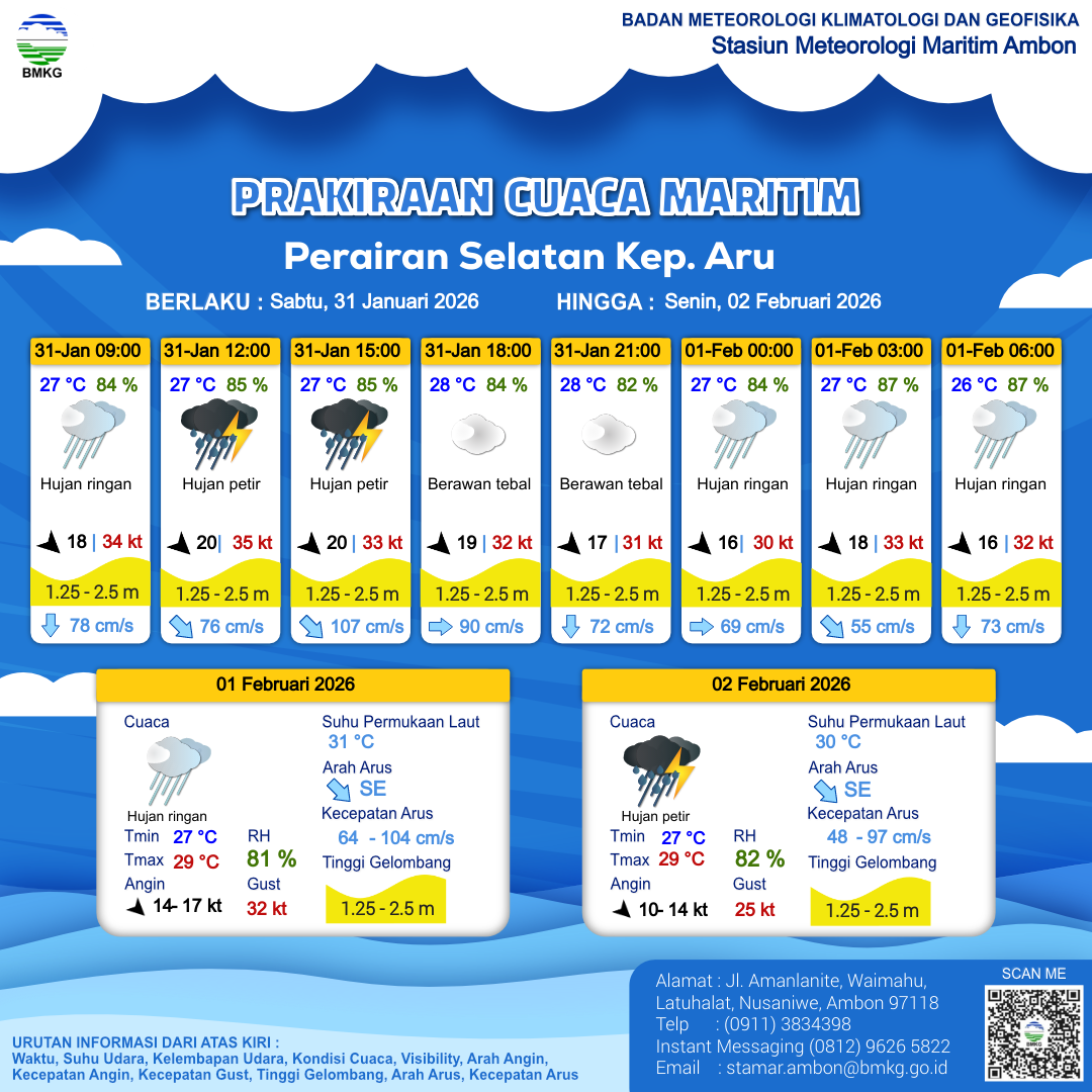 31 Jan 26, 15.00 4 jam kedepan | Barat Laut 18 kt Gust Peningkatan kecepatan angin yang singkat dan tiba-tiba : 28 kt | 1.9 m Sedang | Timur 69.0 cm/s | 28 °C | 82 % | |