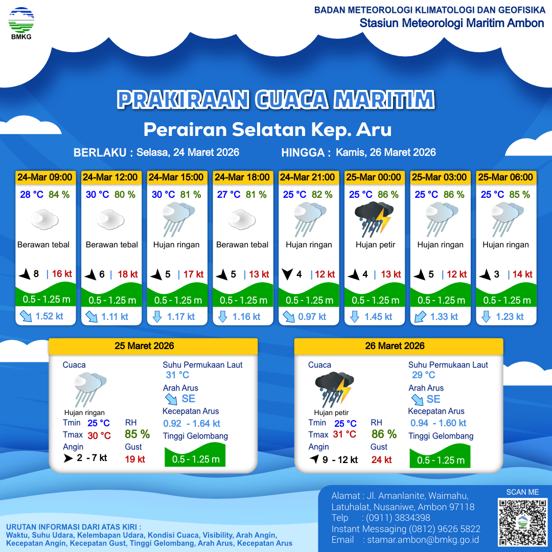 24 Mar 26, 17.00 4 jam kedepan | Utara 2 kt Gust Peningkatan kecepatan angin yang singkat dan tiba-tiba : 10 kt | 0.7 m Rendah | Barat Daya 1.2 Knots | 25 °C | 85 % | |