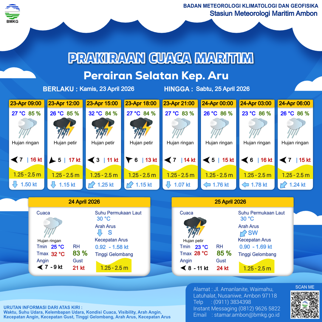 23 Apr 26, 22.00 11 jam kedepan | Timur 5 kt Gust Peningkatan kecepatan angin yang singkat dan tiba-tiba : 15 kt | 1.1 m Rendah | Barat Daya 1.1 Knots | 26 °C | 85 % | |