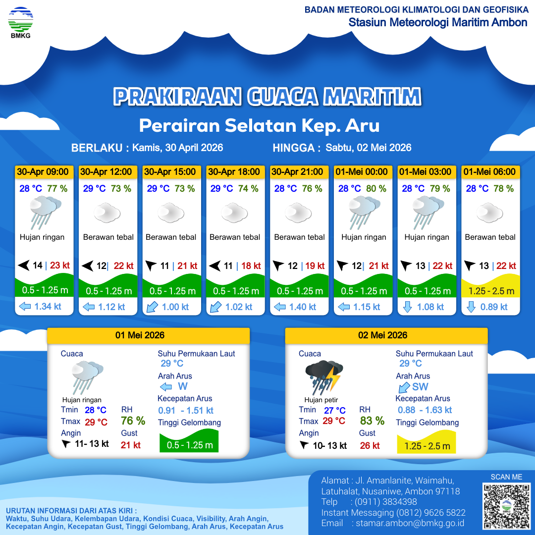 30 Apr 26, 21.00 3 jam kedepan | Hujan Ringan | Tenggara 10 kt Gust Peningkatan kecepatan angin yang singkat dan tiba-tiba : 18 kt | | | 27 °C | 84 % |