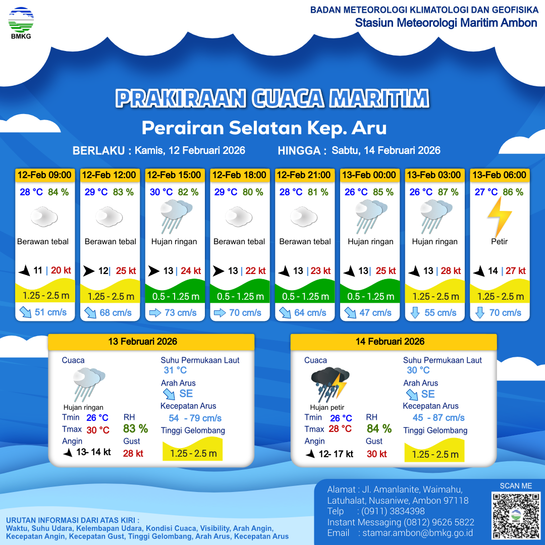 12 Feb 26, 09.00 6 jam kedepan | Barat 11 kt Gust Peningkatan kecepatan angin yang singkat dan tiba-tiba : 20 kt | 0.9 m Rendah | Tenggara 63.0 cm/s | 28 °C | 80 % | |