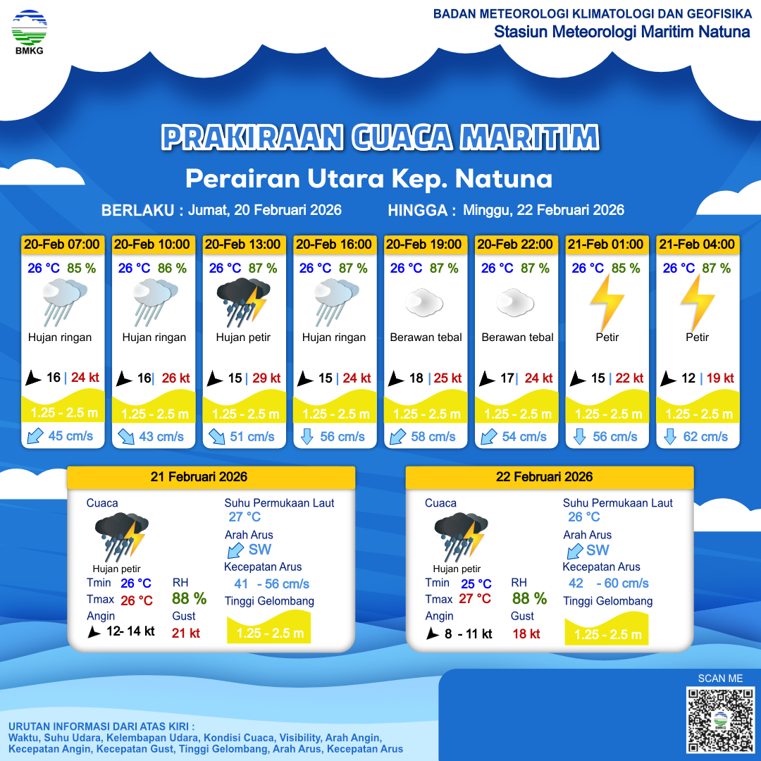 20 Feb 26, 18.00 16 jam kedepan | Timur Laut 15 kt Gust Peningkatan kecepatan angin yang singkat dan tiba-tiba : 22 kt | 2.2 m Sedang | Selatan 56.0 cm/s | 26 °C | 85 % | |