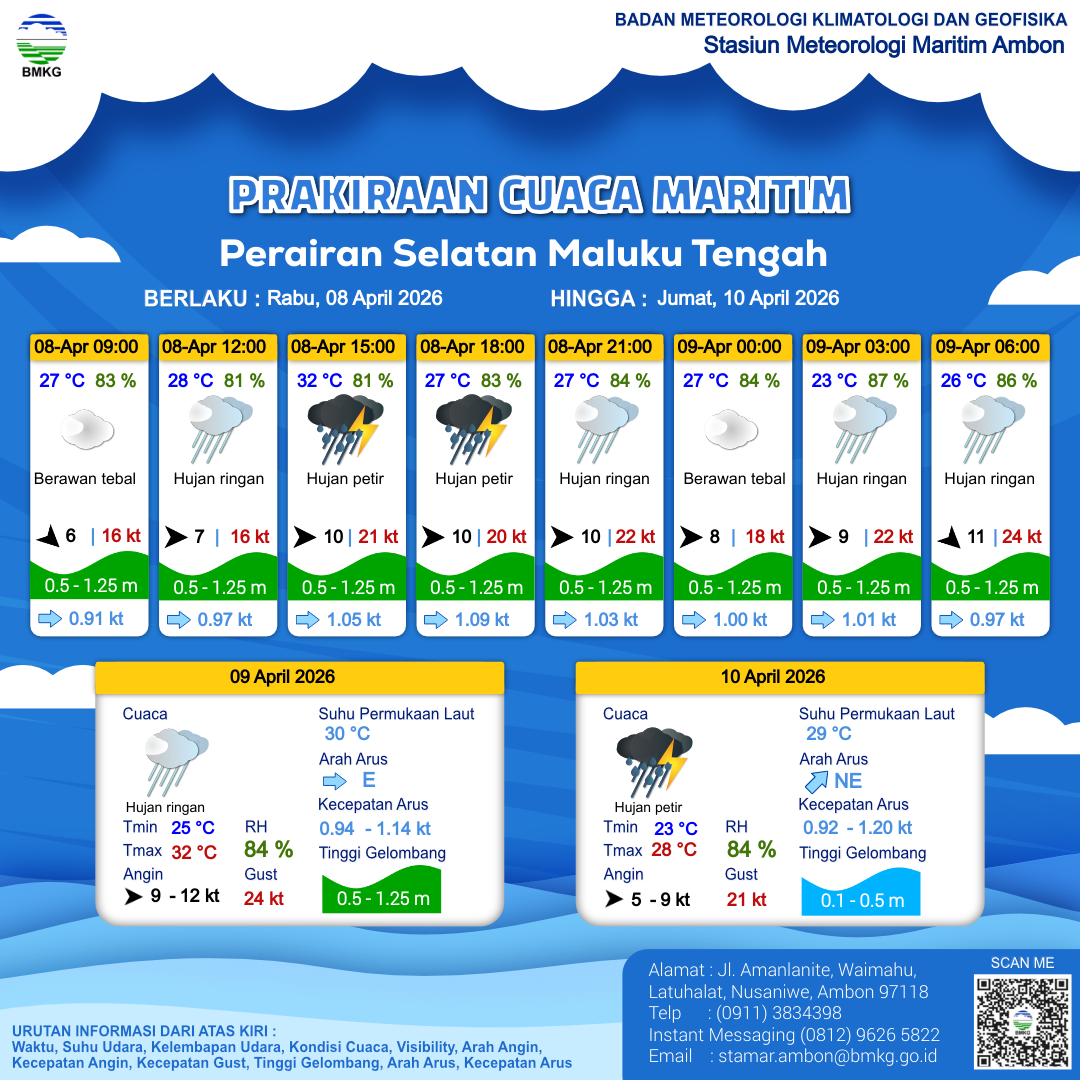 8 Apr 26, 19.00 3 jam kedepan | Barat 11 kt Gust Peningkatan kecepatan angin yang singkat dan tiba-tiba : 22 kt | 0.7 m Rendah | Timur 0.8 Knots | 24 °C | 87 % | |
