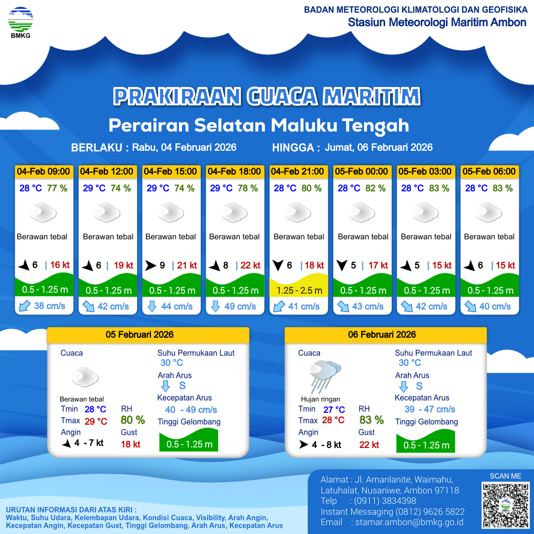 4 Feb 26, 16.00 2 jam kedepan | Barat 11 kt Gust Peningkatan kecepatan angin yang singkat dan tiba-tiba : 20 kt | 1 m Rendah | Tenggara 67.0 cm/s | 28 °C | 80 % | |