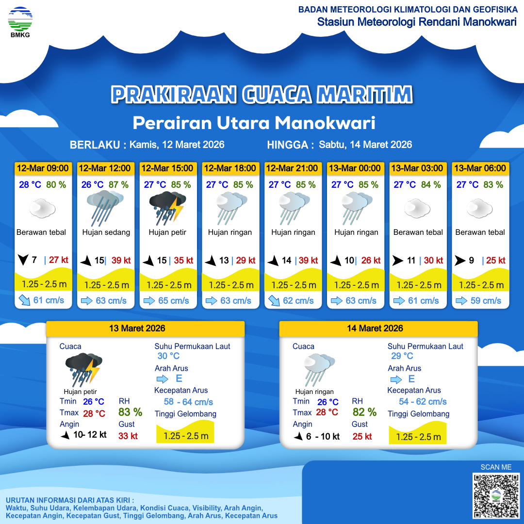12 Mar 26, 20.00 3 jam kedepan | Barat 9 kt Gust Peningkatan kecepatan angin yang singkat dan tiba-tiba : 29 kt | 2 m Sedang | Timur 60.0 cm/s | 27 °C | 83 % | |