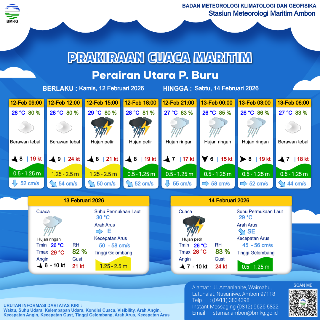 12 Feb 26, 16.00 4 jam kedepan | Utara 6 kt Gust Peningkatan kecepatan angin yang singkat dan tiba-tiba : 15 kt | 1.2 m Rendah | Timur 57.0 cm/s | 26 °C | 86 % | |
