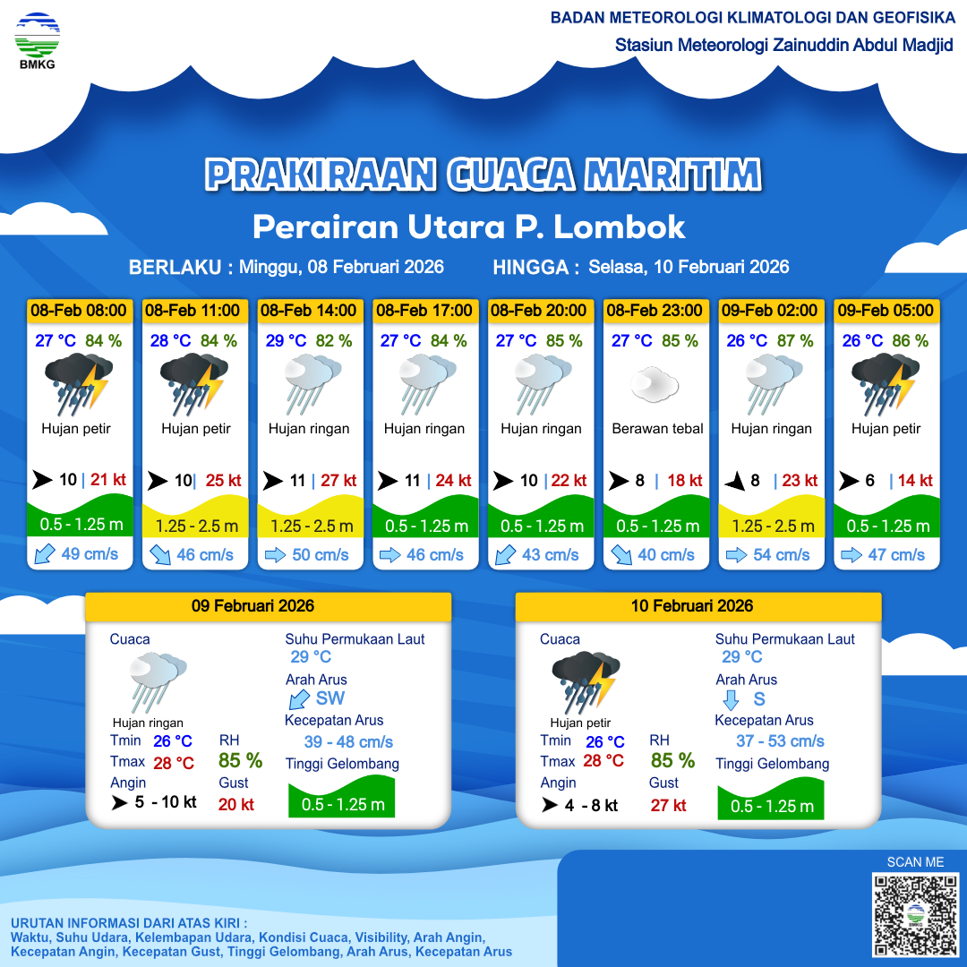 8 Feb 26, 08.00 10 jam kedepan | Barat 11 kt Gust Peningkatan kecepatan angin yang singkat dan tiba-tiba : 26 kt | 1.2 m Rendah | Timur 48.0 cm/s | 27 °C | 84 % | |