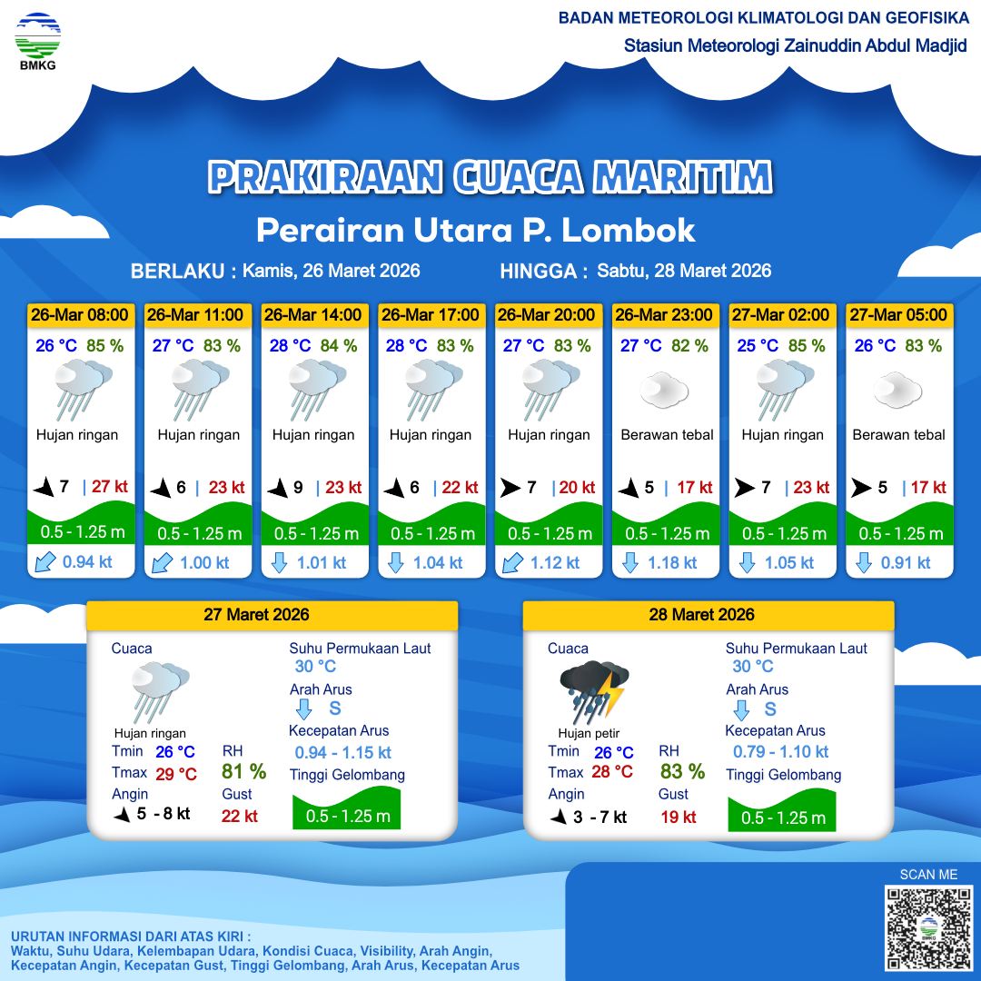 26 Mar 26, 09.00 3 jam kedepan | Barat Laut 6 kt Gust Peningkatan kecepatan angin yang singkat dan tiba-tiba : 22 kt | 0.7 m Rendah | Selatan 1.0 Knots | 28 °C | 83 % | |