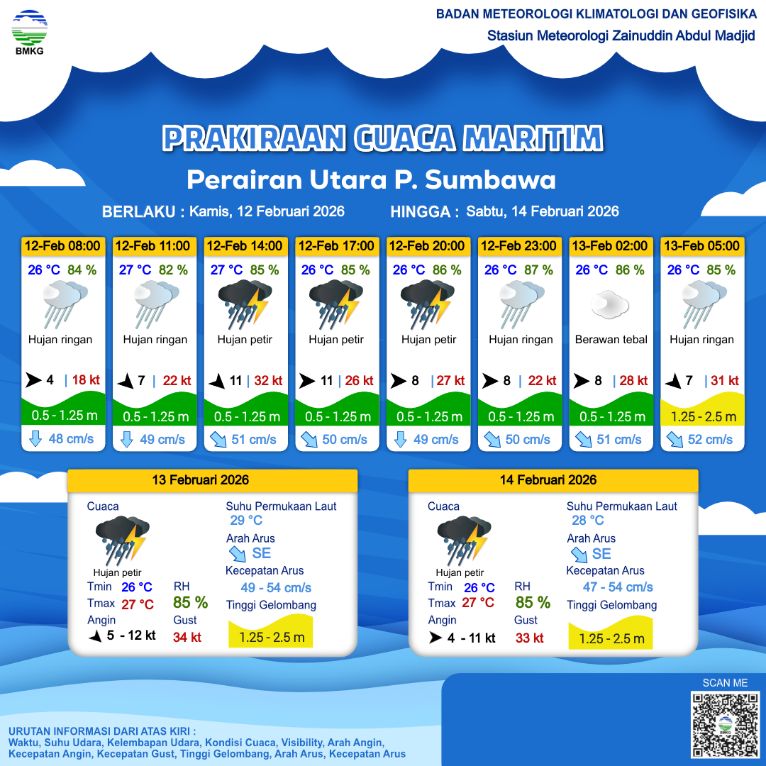 12 Feb 26, 13.00 14 jam kedepan | Barat 8 kt Gust Peningkatan kecepatan angin yang singkat dan tiba-tiba : 24 kt | 1 m Rendah | Tenggara 50.0 cm/s | 26 °C | 86 % | |